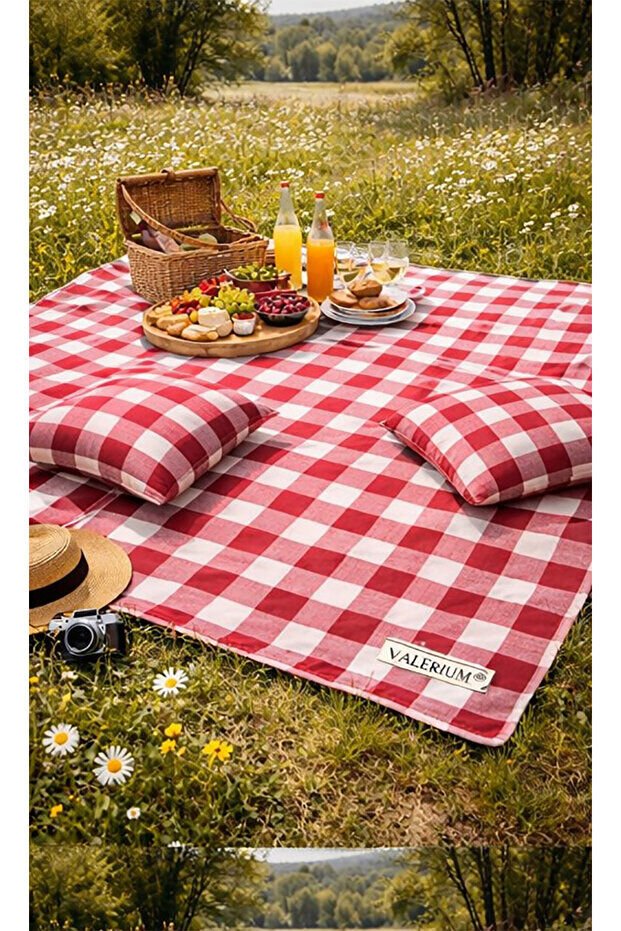 Sıvı ve Leke'ye Dayanaklı Duck Keten Piknik Örtü Seti Kırlentli Kırmızı